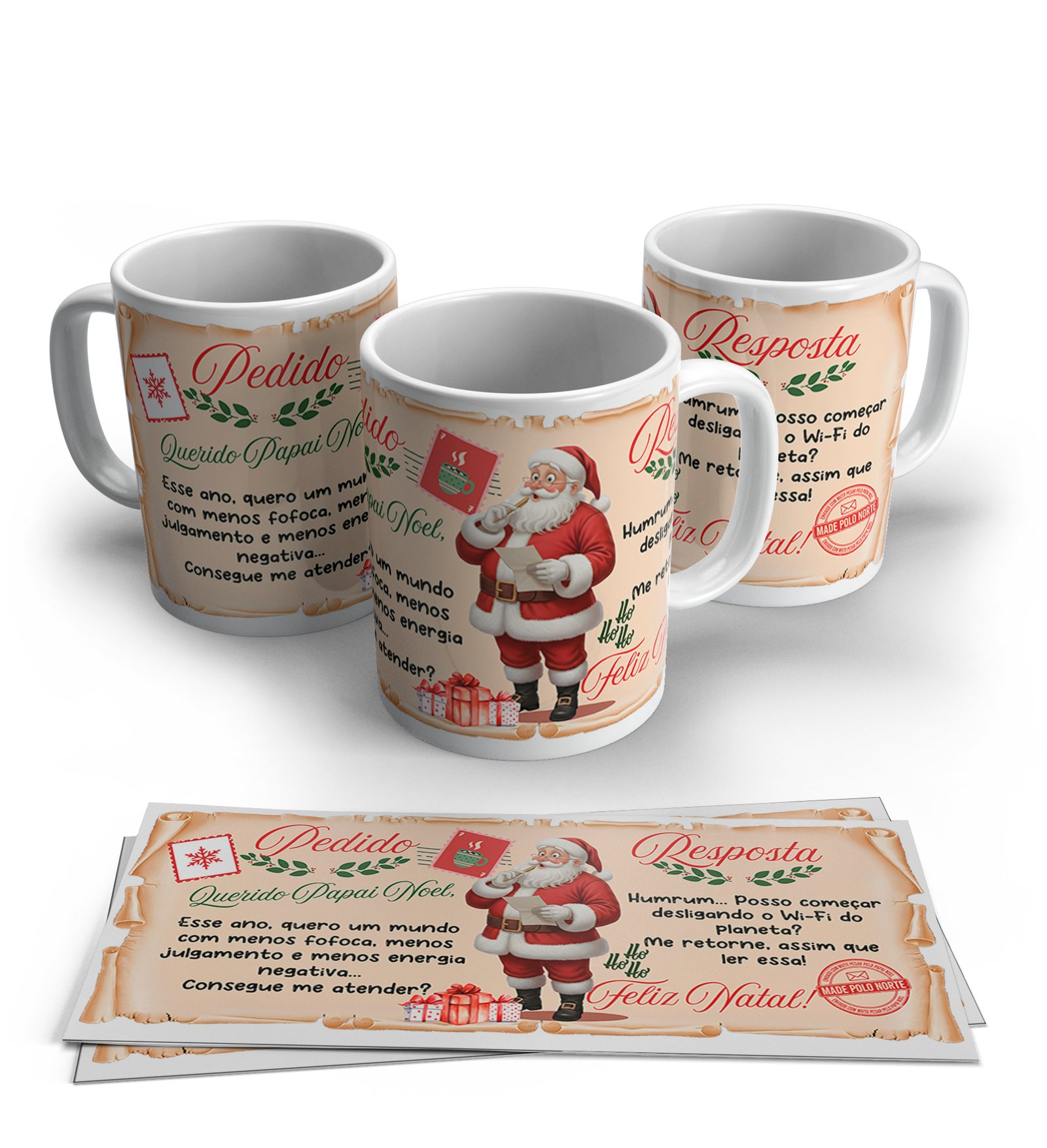 Ideal pra presentear, colecionar ou tomar café rindo dos seus próprios pedidos. 🎅☕