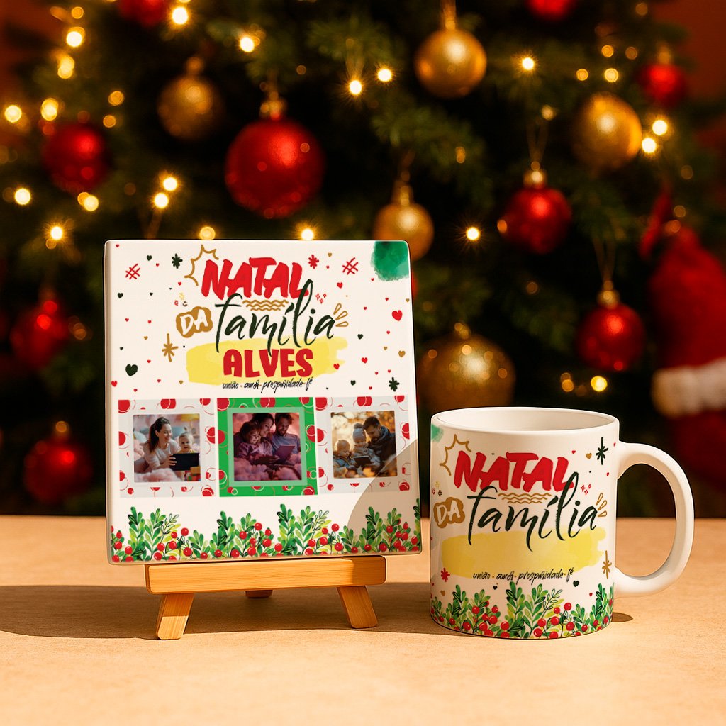 uma caneca em cerâmica premium, perfeita para aquecer momentos especiais, e um azulejo decorativo com arte natalina exclusiva que ilumina qualquer ambiente.