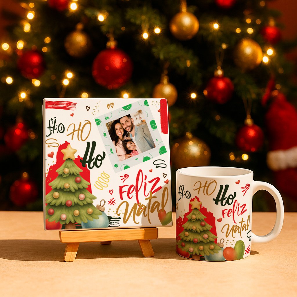 uma caneca em cerâmica premium, perfeita para aquecer momentos especiais, e um azulejo decorativo com arte natalina exclusiva que ilumina qualquer ambiente.