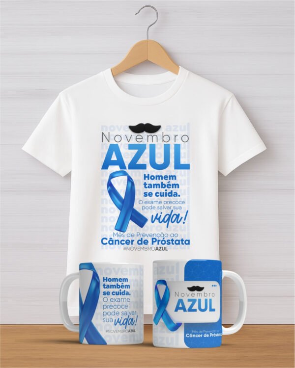 O Kit Novembro Azul reúne duas peças cheias de significado: uma camiseta unissex confortável e uma caneca em cerâmica de alta qualidade.