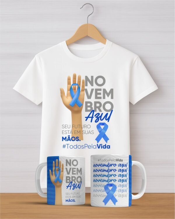O Kit Novembro Azul reúne duas peças cheias de significado: uma camiseta unissex confortável e uma caneca em cerâmica de alta qualidade.