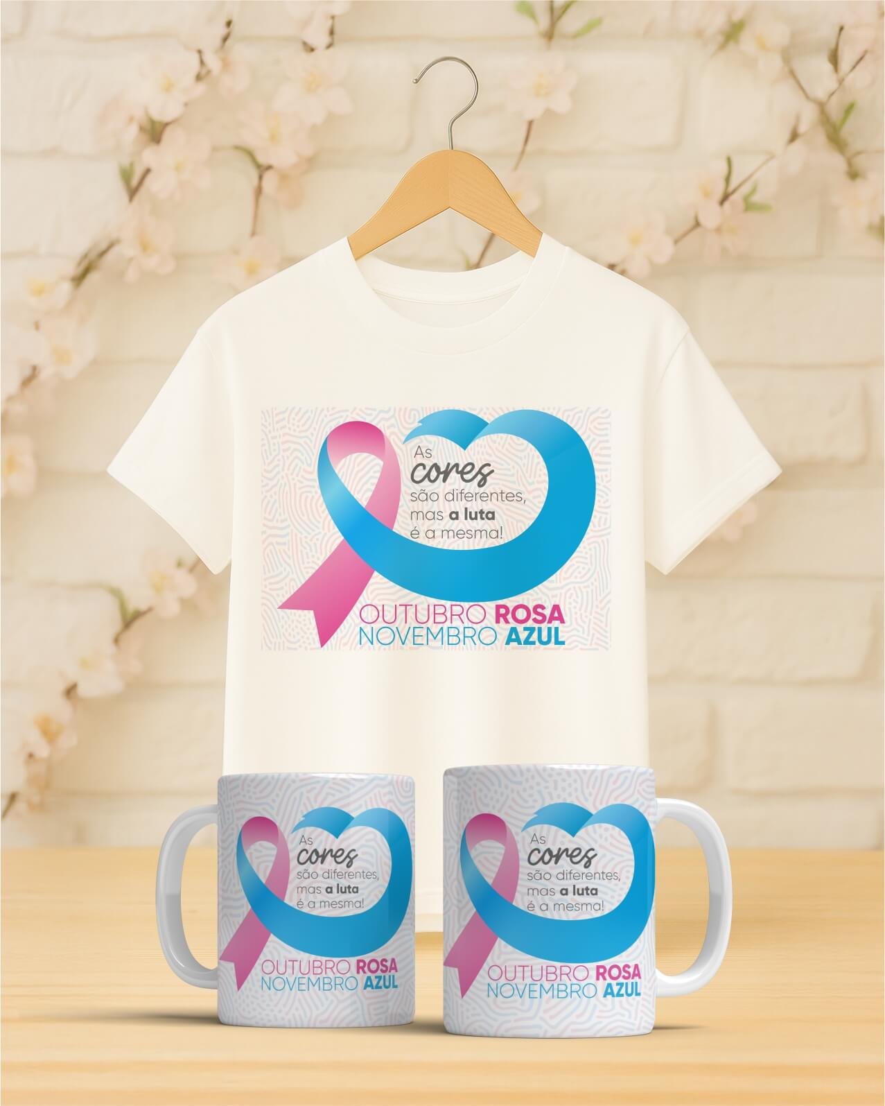 O Kit Outubro Rosa & Novembro Azul reúne duas peças cheias de propósito: uma camiseta unissex superconfortável e uma caneca em cerâmica de alta qualidade.