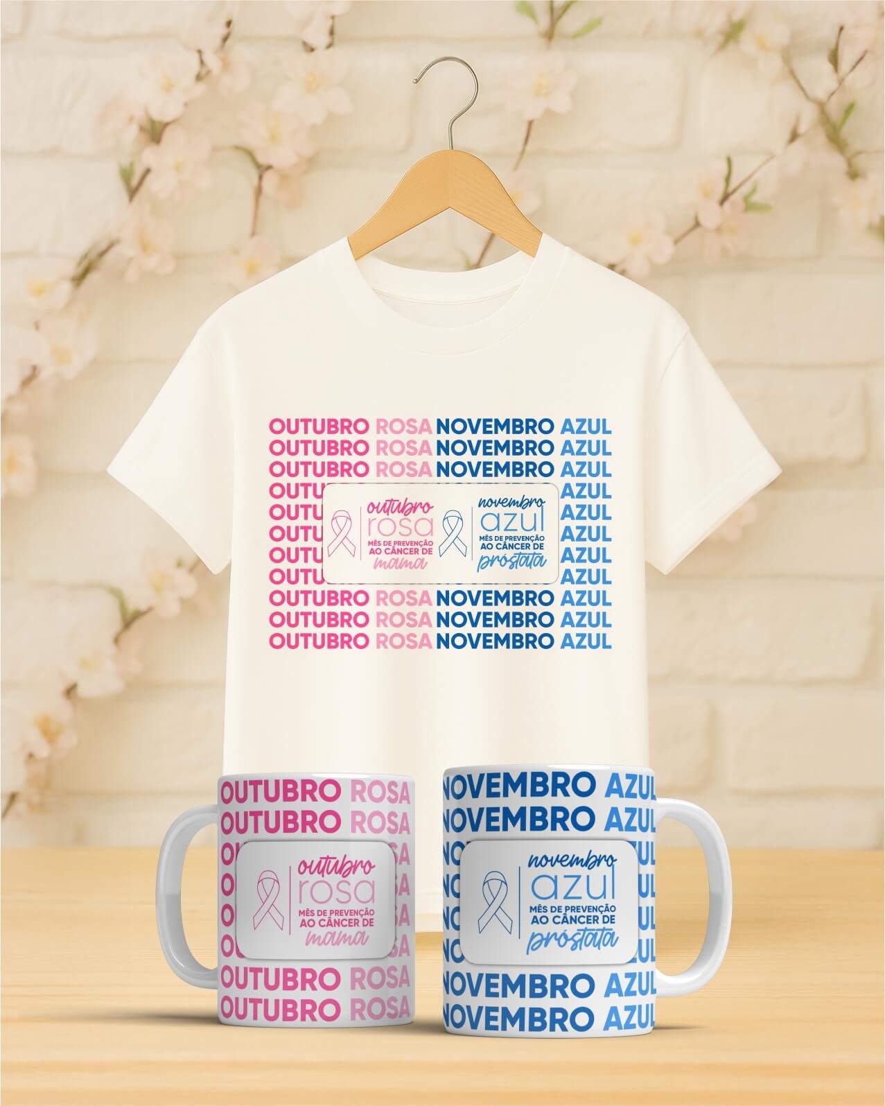 O Kit Outubro Rosa & Novembro Azul reúne duas peças cheias de propósito: uma camiseta unissex superconfortável e uma caneca em cerâmica de alta qualidade.