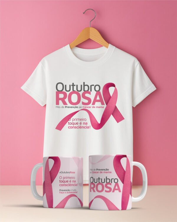 O Kit Outubro Rosa reúne duas peças cheias de significado: uma camiseta unissex confortável e uma caneca em cerâmica de alta qualidade.