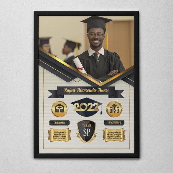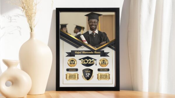 O Quadro Formatura 2025 é o presente ideal para eternizar esse momento único, reunindo nome, curso, data e universidade em um design sofisticado e cheio de significado.