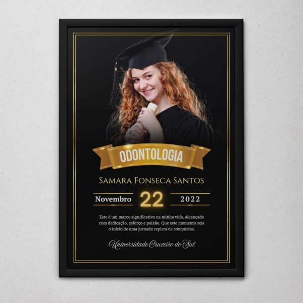 O Quadro Formatura 2025 é o presente ideal para eternizar esse momento único, reunindo nome, curso, data e universidade em um design sofisticado e cheio de significado.